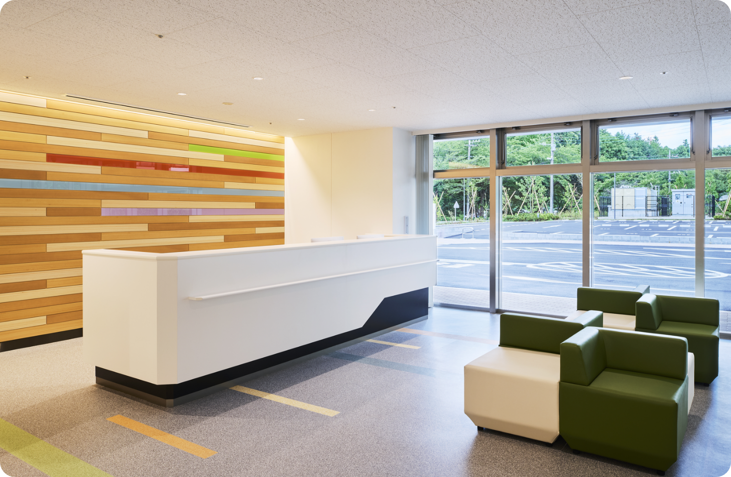 明るく広々としたエントランス。見学やインターンなどでお越しになった際は受付にお声がけください。
