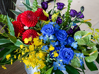 私は、以前よりフラワーアレンジメントを習っています。自分が好きな事を続け、花との出会いを大切に自分自身と向き合い、とても充実した時間となっています。一緒に受講される方々との関わりも緊張感があり、良い刺激となります。職場の理解もあり、時々、施設にアレンジメントの花を持参しています。ご利用者様が花を観て笑顔になることが嬉しく、また、花でコミュニケーションを取れることを楽しく感じます。先生のご提案で作品展が開催され、毎回出展させて頂いています。その中でも一作品は大好きな『嵐』をイメージして花に思いを託して制作しています。今回はコロナ感染を考慮してWEB開催となりました。撮影にも参加させていただき、とても貴重な経験となりました。今後も花の魅力をどんどん伝えていきたいです。